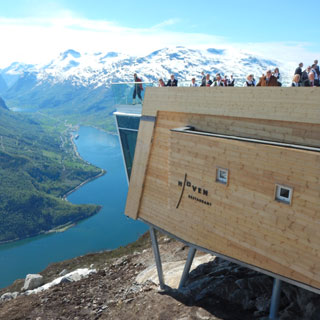Restaurantbygget med sine store vindusflater med panoramautsikt utover Nordfjord har også en takterrasse som er like stor som selve bygget. Den totale høydeforskjellen fra fjorden opp til fjellet Hoven er i overkant av 1000 meter. De to gondolvognene, som har fått navnet Hugin og Munin, tar hver inntil 45 personer i slengen.