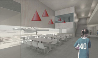 Bygget legger seg inn i fjellryggen ved eksisterende landsskapssluk, og bevarer eksisterende tjern og stedlige kvaliteter. Aktivitetsflaten er 25 x 45 meter.